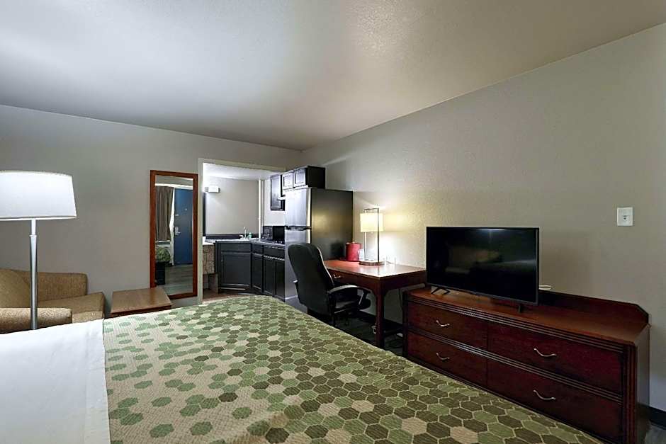 The suite's kitchenette, which has a refrigerator and a microwave, is available for cooking and storing food. This suite features a tea and coffee maker, a seating area and a TV with cable channels.